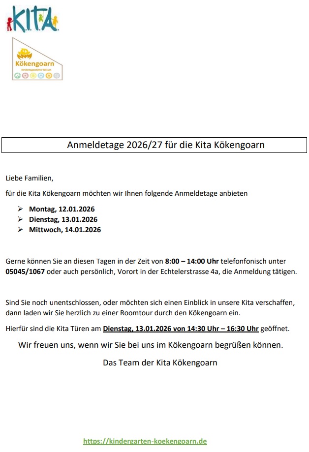 Anmeldetage der Kita Wilsum für 2026 / 2027